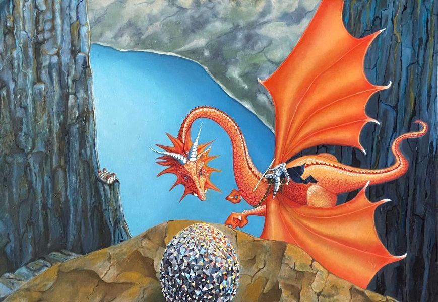 Olieverf op doek | Pauline Maring Fantasie schilderij van een ridder die vliegend op zijn draak het kristallen ei vindt.