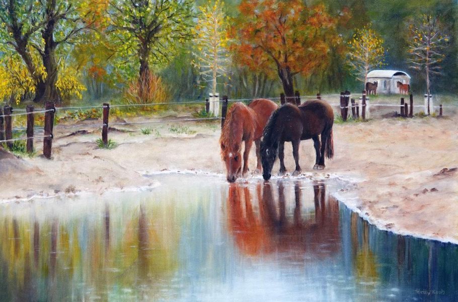 Olieverf op doek - Hetty Uyland Realistisch olieverf schilderij van een drinkende paarden